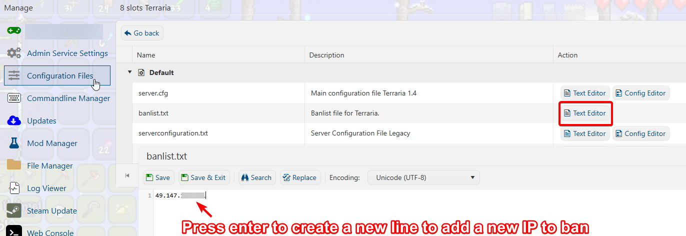 Alternatively, we can edit the banlist.txt directly in the Configuration Files tab.