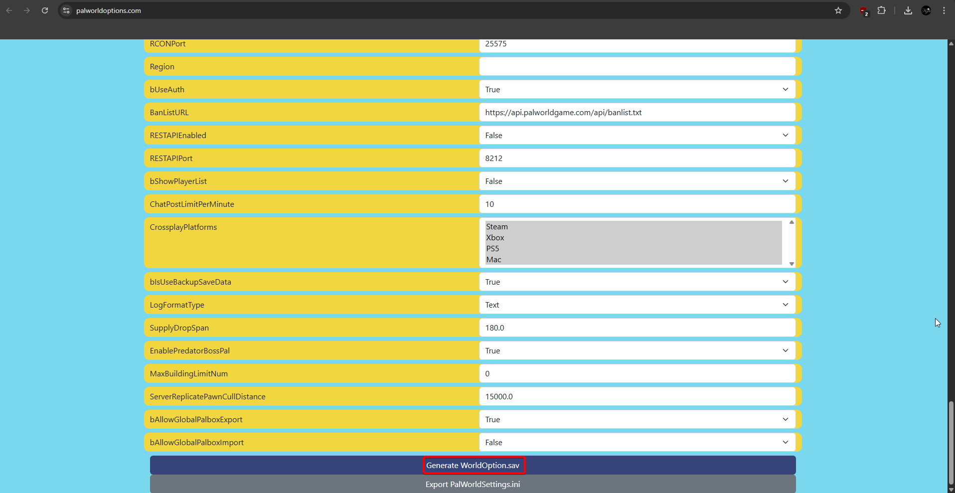Configure the settings and then generate the WorldOption.Sav file at the bottom.